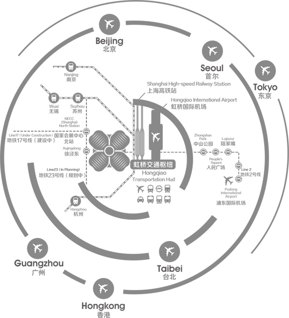 轨道交通2号线徐泾东站4、5、6号出口 出租车1、高架道路:延安高架、南部外环高速方向,嘉闵高架-建虹高架-盈港东路-诸光路(国家会展中心西门);北翟高架、北部外环高速方向,嘉闵高架-崧泽高架-蟠龙路下匝道-龙联路-诸光路(国家会展中心西门)。 2、地面道路:北翟路/天山西路/仙霞西路方向,申长路或华翔路-崧泽大道-诸光路(国家会展中心西门);延安路方向,延安西路-沪青平公路-诸光路(国家会展中心西门)。出租车由诸光路西入口经20号门到达北厅外专用车道边下客,空载出租经由18号门进入场馆指定区域蓄车。 公交线路1、865路:可驳接地铁上海动物园、漕河泾开发区、锦江乐园站; 2、706路:可驳接地铁九亭站;3、776路:可驳接地铁紫藤路、中山公园站。 展览期间接驳巴士1、虹桥机场T1航站楼:空港一路上下客点,连接轨道交通10号线; 2、虹桥西交通中心:申虹路上下客点,连接虹桥机场T2航站楼与虹桥火车站; 3、上海西站:01路公交终点站上下客点,直达上海西站,连接11号线; 4、上海体育馆:111路公交终点站上下客点,直达上海体育馆公交枢纽,连接1、3、4号线。国家会展中心内部接驳巴士上下客点设在北厅外指定区域。 自驾车1、从上海市区: