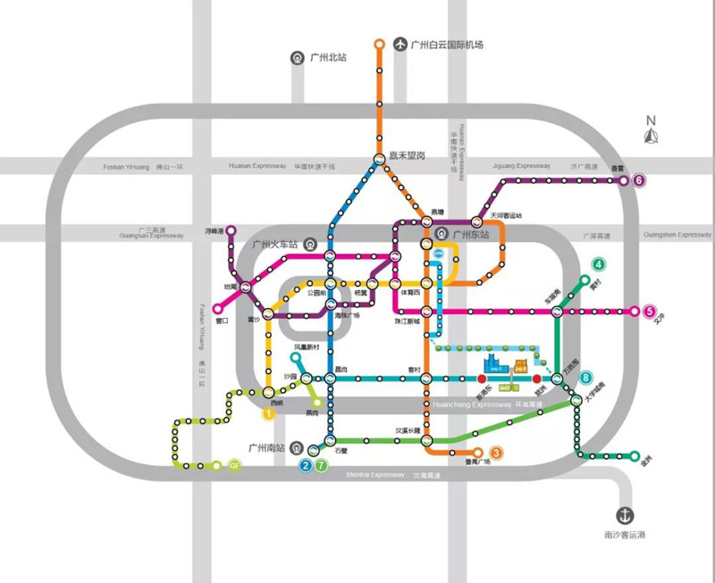 3号线(北延长线)机场北站(2号航站楼)/机场南站(1号航站楼)- 体育西路站(转乘3号线) - 客村站(转乘8号线)- 新港东站(广交会展馆A区)/琶洲站(广交会展馆B区和C区)